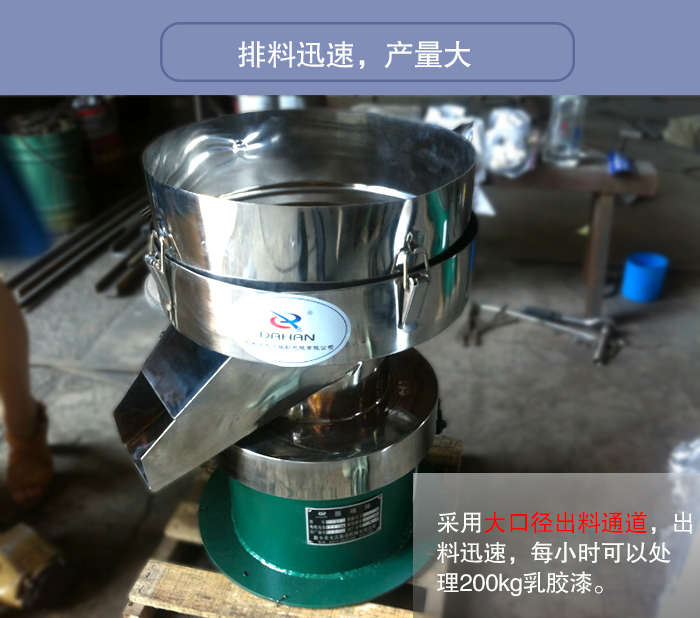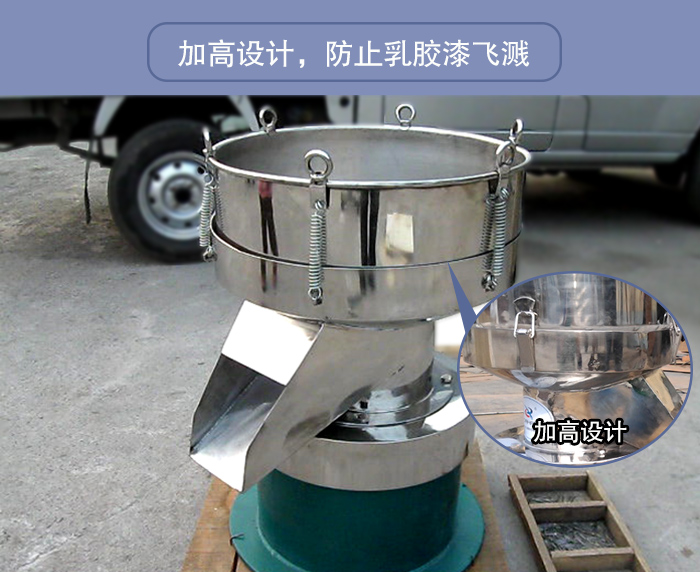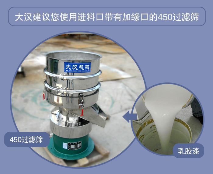 乳膠漆是一種帶有一定黏稠度的漿液,但是在其進行加工過程中,需要使用振動篩對其進行除雜過濾,由于考慮到乳膠漆在篩分過程中可能發生的漏液、飛濺情況,大漢小編建議大家使用使用進料口帶有加緣口的450過濾篩進行篩分。