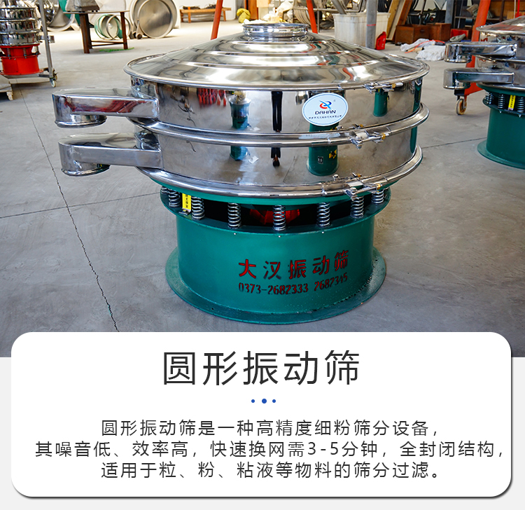 圓形振動篩外觀為圓形,是一種高精度粉末,顆粒,液體篩分設備,可篩分至500目,材質有碳鋼和不銹鋼,有1-6層,可將物料篩分成2-7種規格,噪音低、效率高,快速換網需3-5分鐘,全封閉結構。